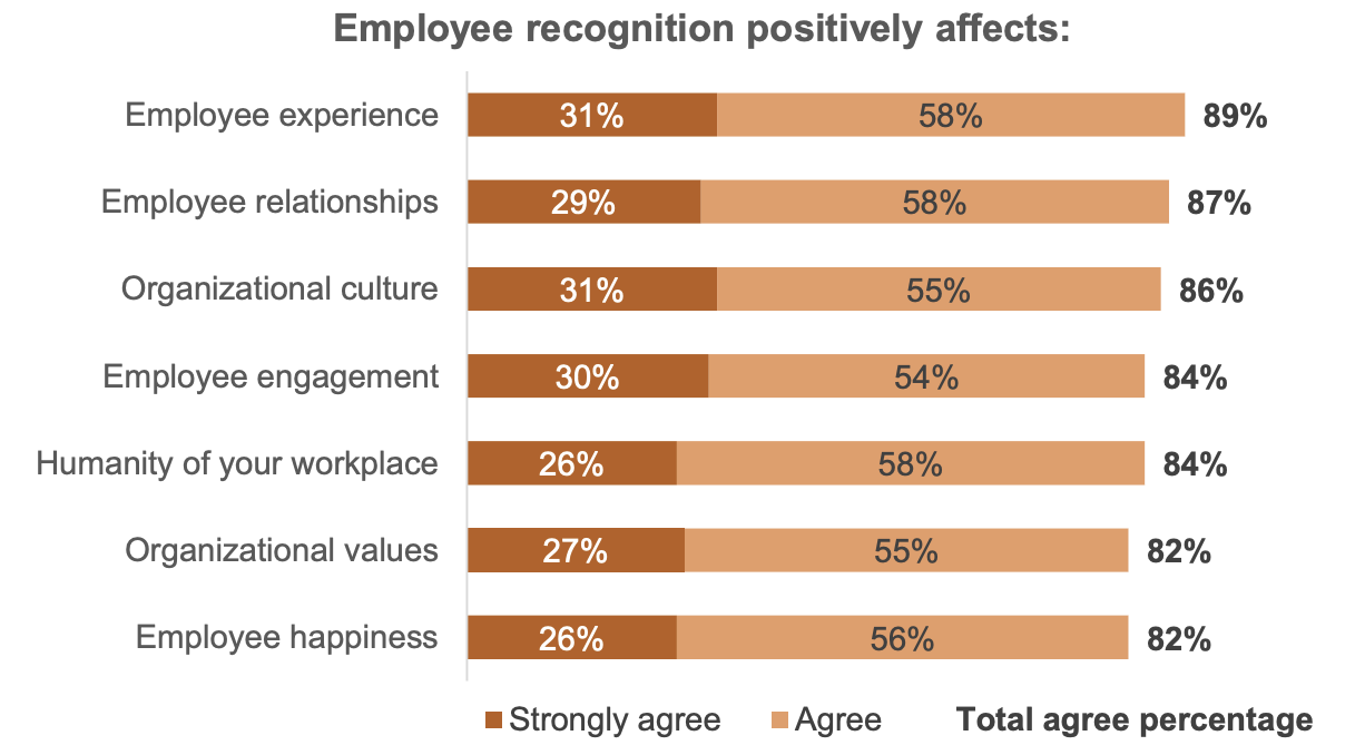 Appreciation in the workplace positively affects almost every element of the employee experience, according to 2018 data from Globoforce. Not only are employees more engaged, but company culture, employee relationships and overall workplace happiness improves as well.